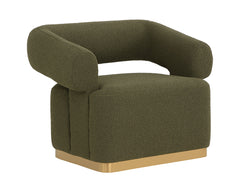 The Aggie Swivel Lounge chair is a statement-making mid-century accent chair with curves in all the right places. Upholstered in copenhagen olive fabric or milliken cognac faux leather and rhea light barley fabric with a brushed gold stainless steel base, this lounge chair is a beautiful spectacle with its harmonious mix of textures.