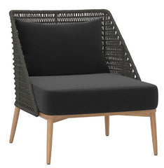 Lose track of time while relaxing in this outdoor lounge chair. This modern design features a tapered seatback covered in dark grey weave with an arashi black fabric seat or greymix weave with a palazzo taupe seat and natural teak wood base. Teak wood will develop a silver-grey finish over time.