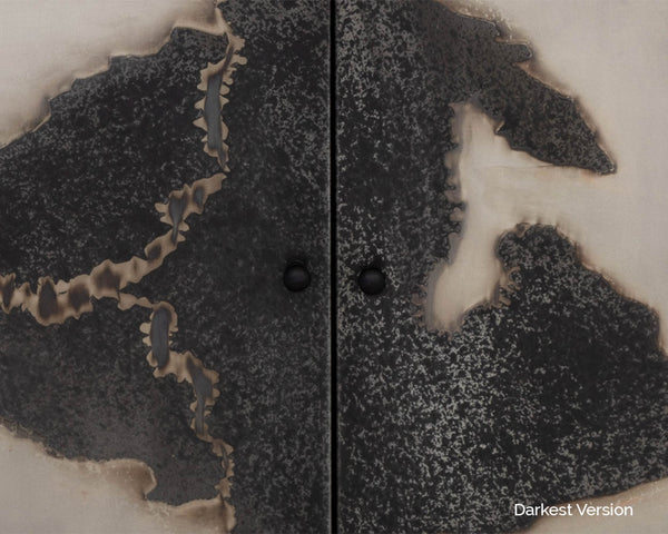 Make a bold statement with this unique bookcase. Cabinet feature a one-of-a-kind patina finish, boldly contrasted with a black iron frame.