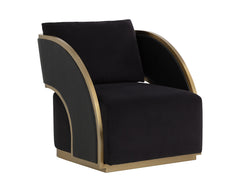 Bold and stylish, the Baz Swivel Lounge Chair is sure to turn heads. Featuring a daring silhouette upholstered in napa black faux leather and abbington black fabric. Gold stainless steel detailing and channel stitching add depth and visual impact to the overall look of the piece.