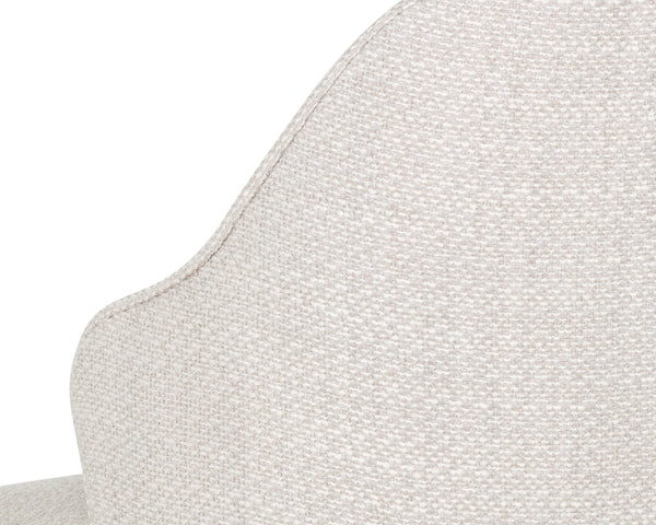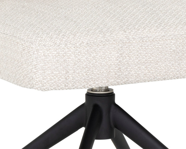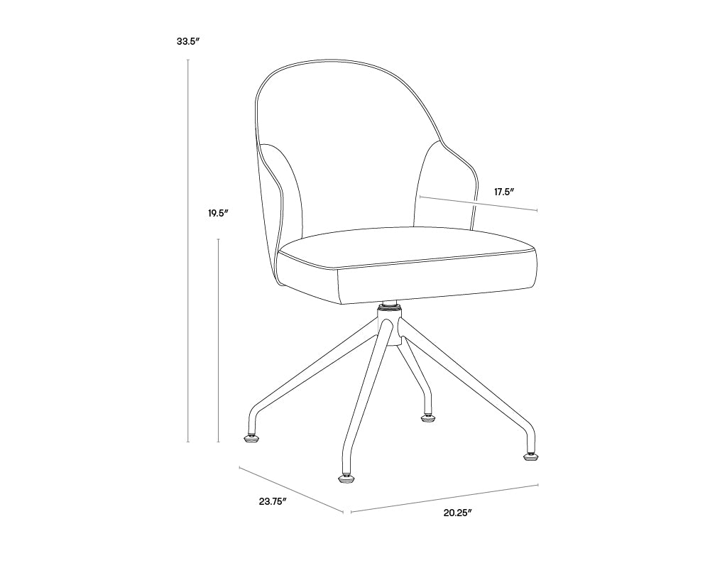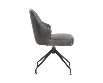 A handsome swivel dining chair designed for transitional and modern spaces. Features a curved seatback in tobacco tan and overcast grey faux leather or moto stucco fabric with a black iron base.