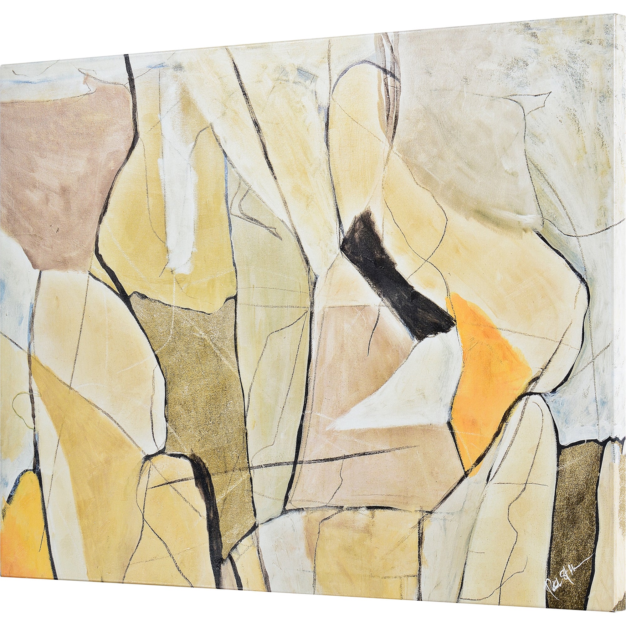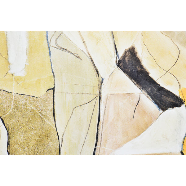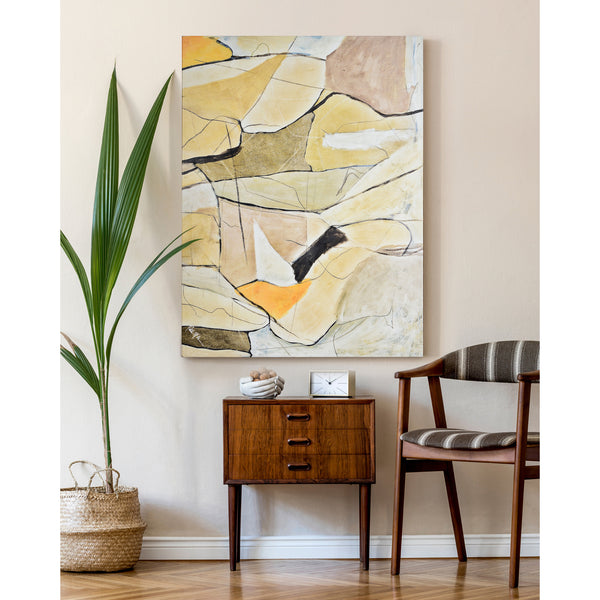 A pastel palette brings a soft, still quality to the modern art inspiration in this design. No matter the setting or hang way, its complexity will be ultimately enhanced by little interference. Hanging vertically or horizontally, this printed piece has tones of sage greens and splashes of yellow, adding to its welcoming nature.