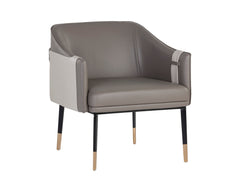 A unique barrel back lounge chair upholstered in supple napa taupe faux leather and accented with a contrasting exterior in napa stone faux leather. Finished with black steel legs and copper foot caps. Suitable for residential and commercial spaces.