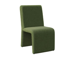 Create an alluring dining space with this modern dining chair that features an intriguing silhouette. Stocked in effie linen, meg rust or moss green fabric with a fully upholstered wooden base.
