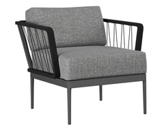 This beautiful outdoor armchair marries mixed materials and thoughtful design for an eye-catching look. Relax in a comfortable seat covered in covered in copacabana grey fabric and finished with a dark grey powder coated aluminum frame and dark grey weave.