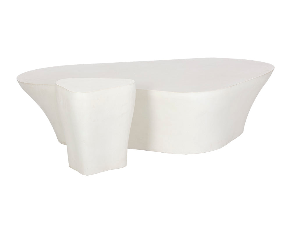 With a distinct curvy design, this coffee table is guaranteed to bring allure to any space. Crafted from white concrete to provide style and durability in various applications. Suitable for indoor and outdoor covered spaces. Coordinating end table in small and large sizes also available.