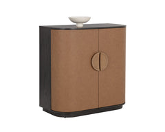 Mid-century flair and expert craftsmanship give the Dresden Bar Cabinet a handsome form. Constructed from smoke grey oak veneer and rubberwood with milliken cognac faux leather on the doors for an intriguing look. Textured circular handles in solid oak wood add a global flair. This cabinet features built-in storage for wine and stemware.