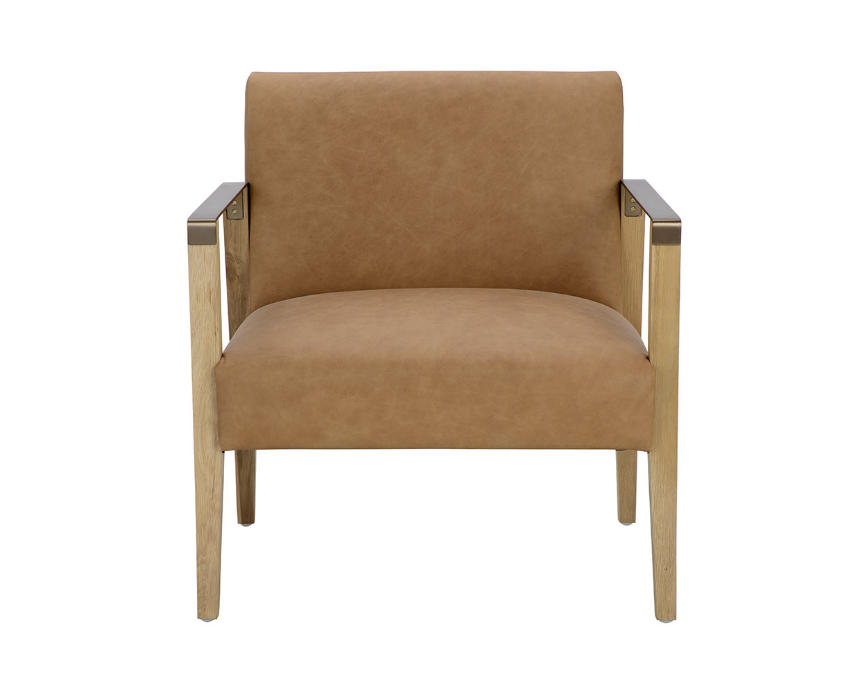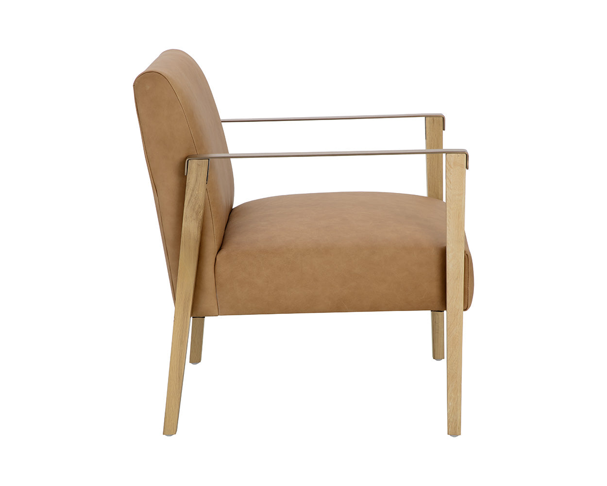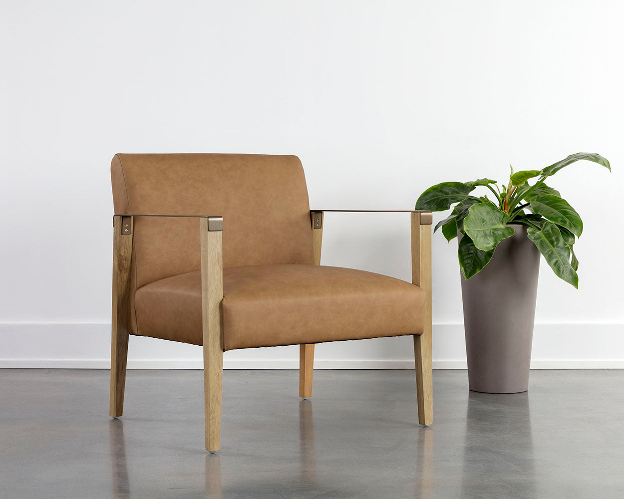 Modern with a refined edge, this lounge chair will bring comfort to any space without compromising style. Stocked in brentwood charcoal leather with a solid ash grey oak wood frame or ludlow sesame leather with a rustic oak wood frame. Completed with accenting pewter metal armests.