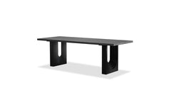 The Echo Dining Table showcases a sturdy concrete top paired with a stylish black oak base, distinguished by its elegant curved detail that pays homage to Art Deco architecture. With ample space to comfortable accommodate eight people, this table is perfect for both gatherings and intimate dinners, blending durability with sophisticated design.