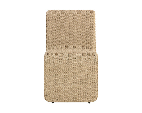 The Edessa Dining Chair features a modern armless silhouette with alluring curves that create its cascading shape. Twisted wicker in a black finish is weaved around an aluminum frame to give this dining chair a light and airy feel. Dine al fresco in style. Suitable for indoor and covered outdoor spaces.