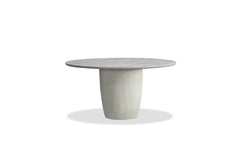 Introducing the Erden Dining Table: where elegance meets modern design. With its stunning, silver-grey travertine marble top, this table effortlessly enhances any dining space. The rounded top adds a touch of softness, inviting warmth and intimacy to your gatherings. The minimal base is made from micro cement in a silver taupe which complements the luxurious marble surface.
