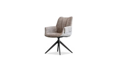 The Espara Swivel Dining Chair features a distinctive two-toned seat and back. Avena oat and alcantara on the exterior complement the alpaca chenille interior, while a matte taupe powder-coated steel base completes the design. Get the full look with the Camber Dining Table, a perfect match.