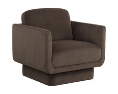 A modern lounge chair that exudes classic comfort. Features U-shaped arms with rounded edges that sit atop a square base to give the chair a floating appearance. Fully upholstered in a smooth meg dark brown, rust or taupe fabric.