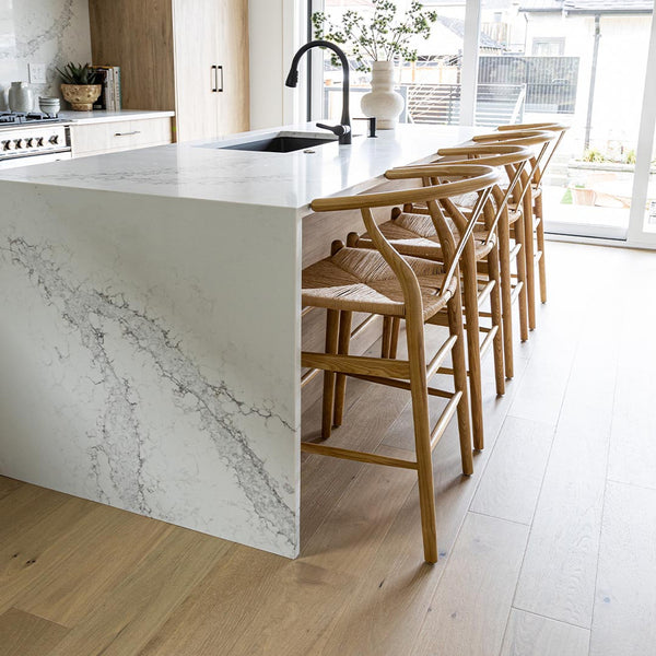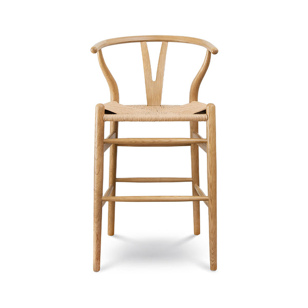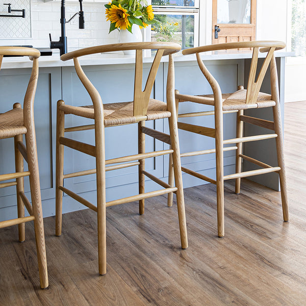 This piece is the epitome of natural simplicity. Inspired by the mid-mod 1950s Hans J Wegner wishbone chairs, these counter stools offer a minimalist aesthetic and airy feel. The Y-back design creates an organic vibe that will help this piece fit seamlessly into any space. The curving top rail and tapered legs are stunning details that elevate this piece to the next level. The natural paper rope seat is woven into perfect comfort, so you can sit back and relax in style.