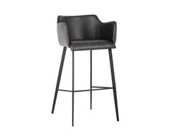 - This modern barstool will provide comfort and style to any residential or commercial space. Features an interior seat and a contrasting channel stitched exterior seatback. Finished with sturdy black powder coated iron legs.