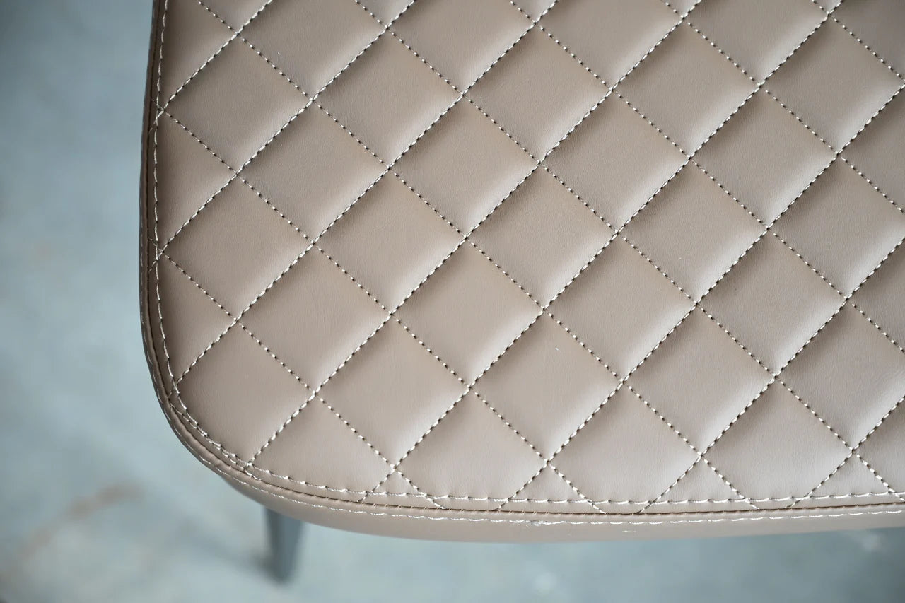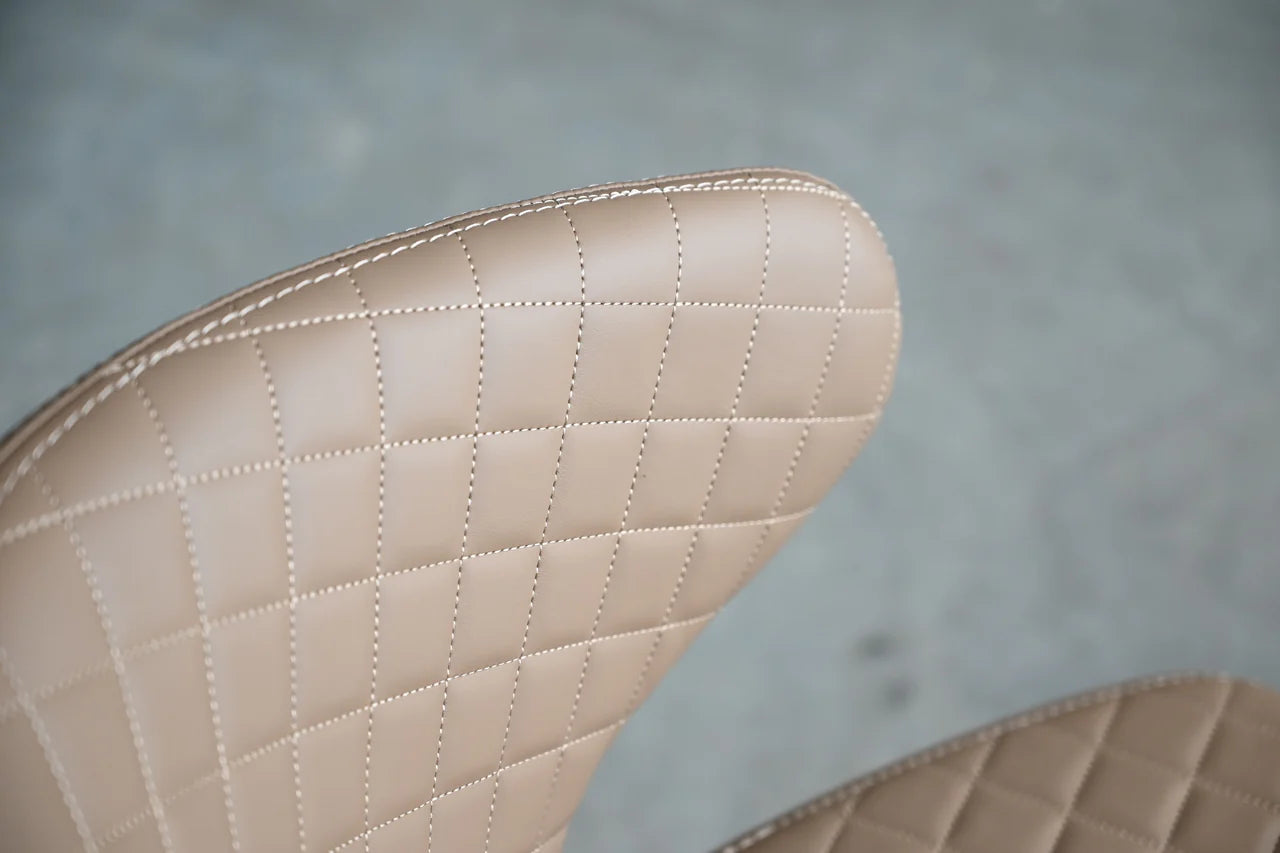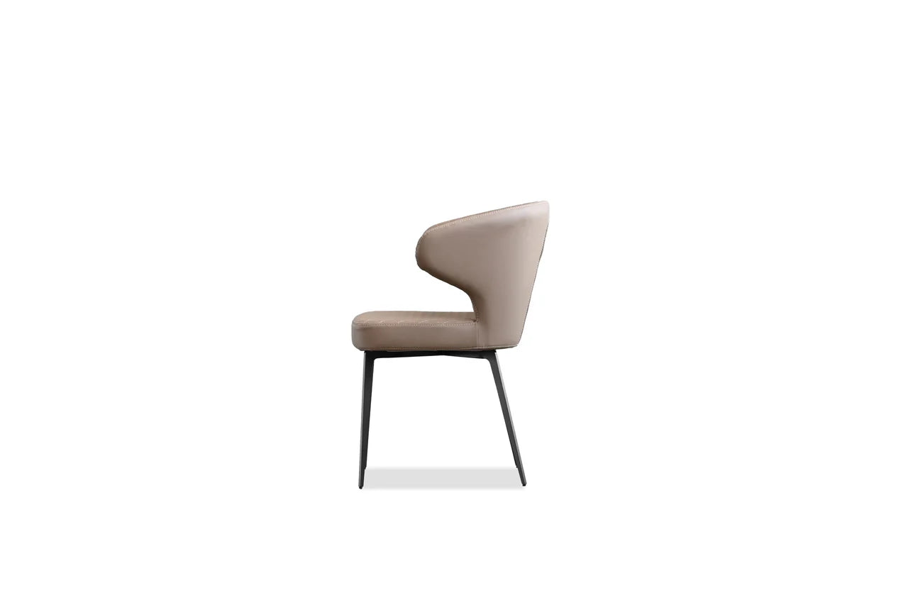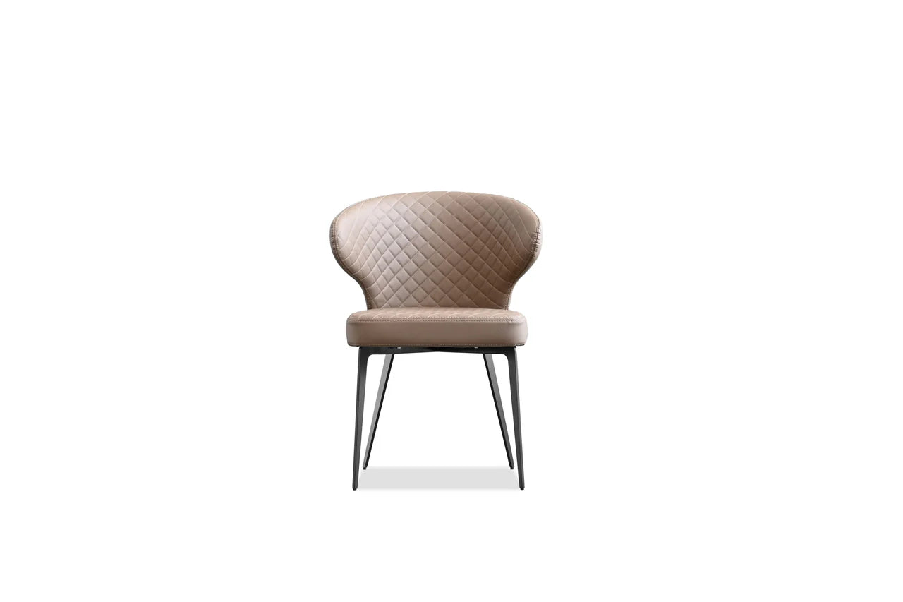 The Hug Dining Chair has a curved back that does exactly what its named after: hugs you into comfort. This chair is upholstered in a buttery soft leatherette and available in either jet black or russet brown. The Hug features a diamond tuft quilt pattern and a black powder-coated unwielded steel base leg. The Hug collection offers a matching stool option in both colorways.