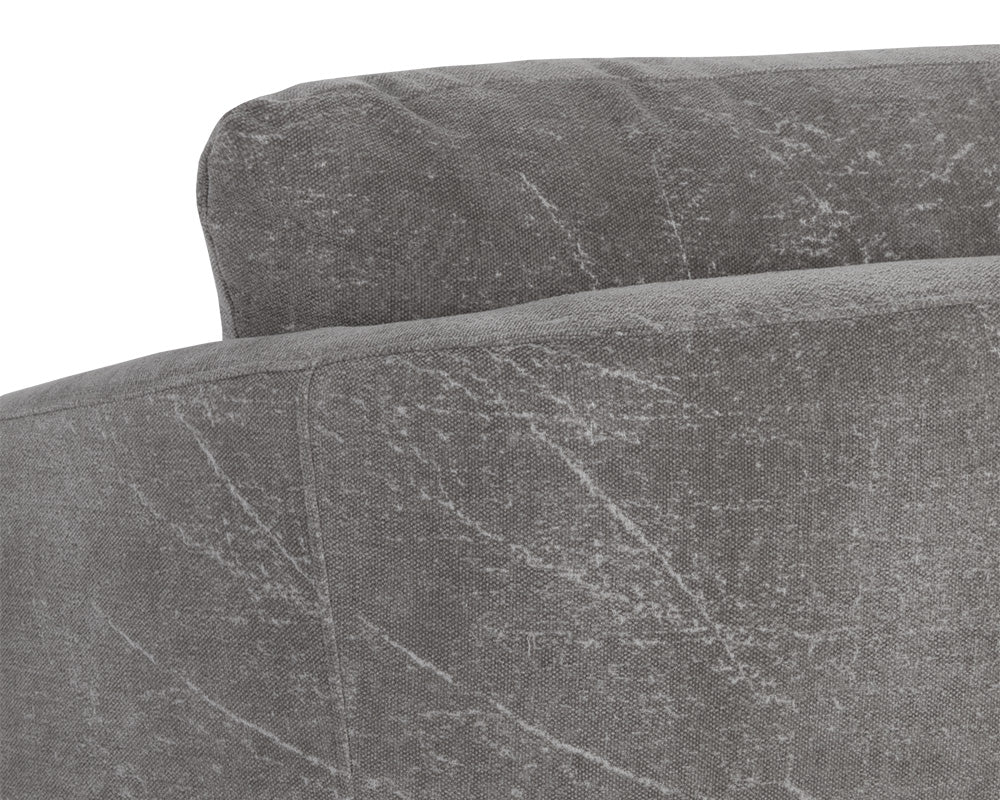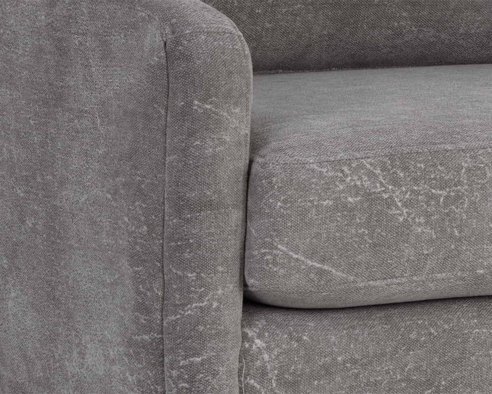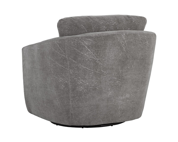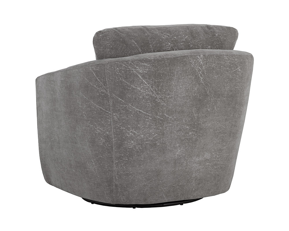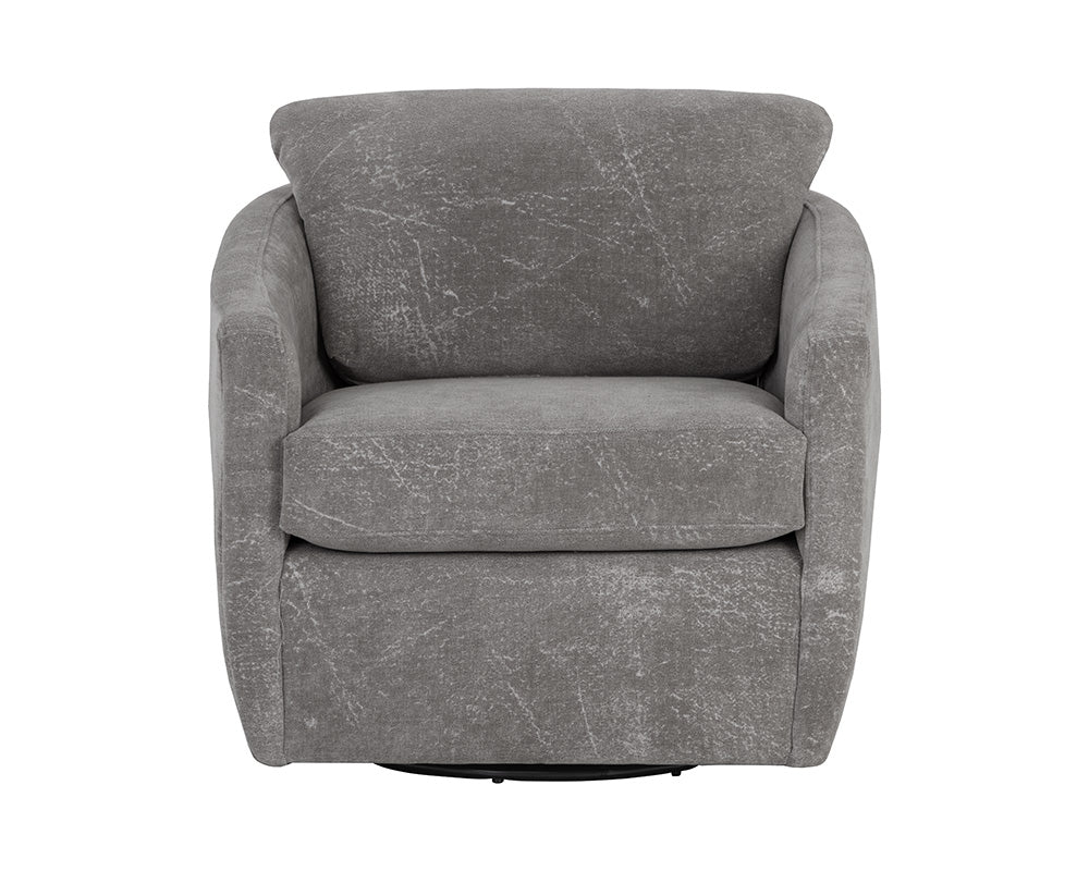Unwind in comfort with this stylish and modern swivel lounge chair. Stocked in nepal pebble, a textured material with lighter streaks all throughout. Completed with a black powder coated steel base.
