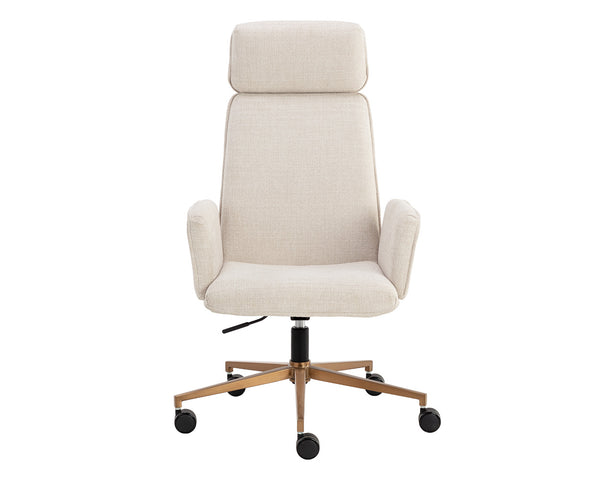 A classic silhouette and subtle curves make the Kalev Office Chair perfect for any workspace. Upholstered in chacha cream or textured noah meadow fabric with plush comfortable seating. Contrasting gold accents behind the arms and headrest match the sleek stainless steel base for added style.