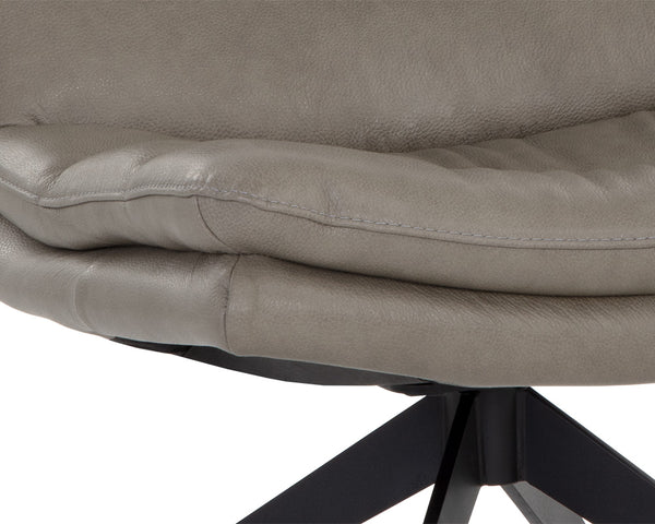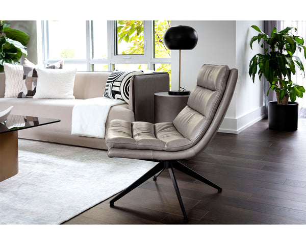 Lounge in comfort with this stylish, mid-century modern swivel lounge chair. Features horizontal tufting with a generously-cushioned seatback for superior comfort. Upholstered in stone Italian bovine leather, and completed with a black powder coated steel base.