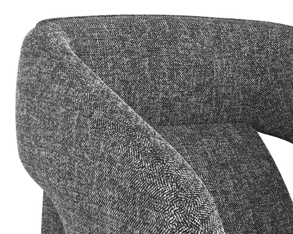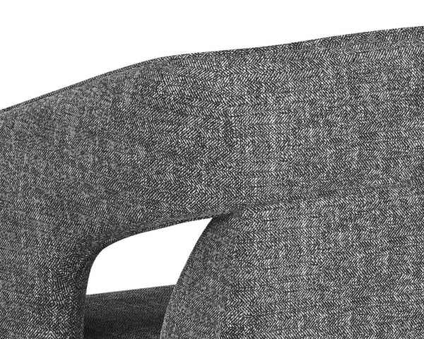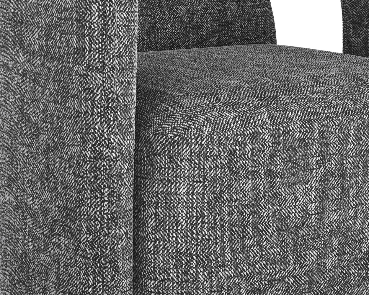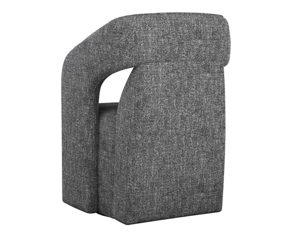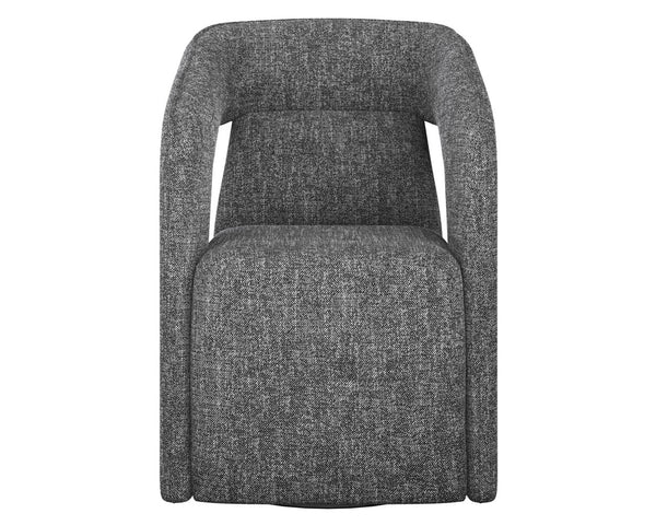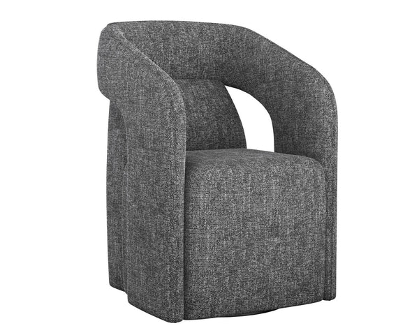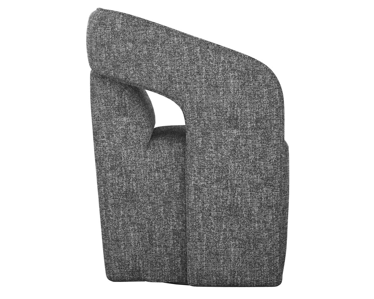 A futuristic wheeled dining armchair featuring cut out arms and a large, comfortable seat. Stocked in abbington black and moto stucco fabrics.
