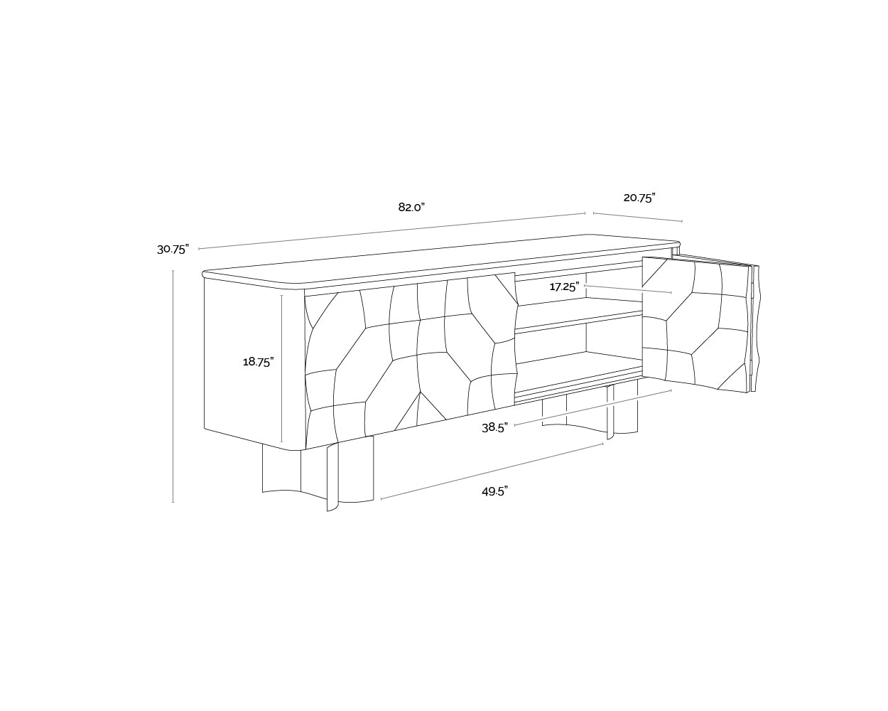 Bold design and mixed materials establish the modern presence of the Lautrec Sideboard. Crafted with stainless steel and a stunning cream marble top, the Lautrec features captivating textural forms on the front sliding doors. Supported with uniquely curved legs in an antique brass finish.