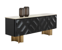 Bold design and mixed materials establish the modern presence of the Lautrec Sideboard. Crafted with stainless steel and a stunning cream marble top, the Lautrec features captivating textural forms on the front sliding doors. Supported with uniquely curved legs in an antique brass finish.