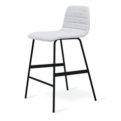 The Lecture Stool is a modern reinterpretation of a classic elementary school chair design, adapted for bar height use. The design features a one-piece, bent-plywood seat and back, with a functional leather and brass handle. The black, powder-coated steel legs are reinforced with sturdy flat bar stabilizers and a simple ergonomic footrest.