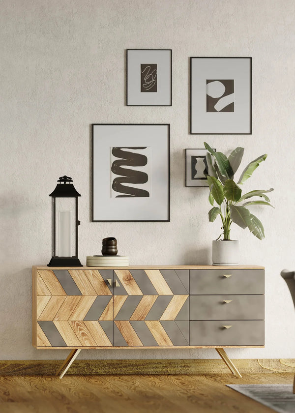 This bold yet neutral sideboard, made from sustainably sourced Mango wood, concrete, and sturdy steel, offers a great balance between form and function. Daily essentials or fine tableware can be concealed due to its purposeful hidden storage. With its angled brass-toned legs and geometric design, this sideboard provides a retro and elegant touch to any room.