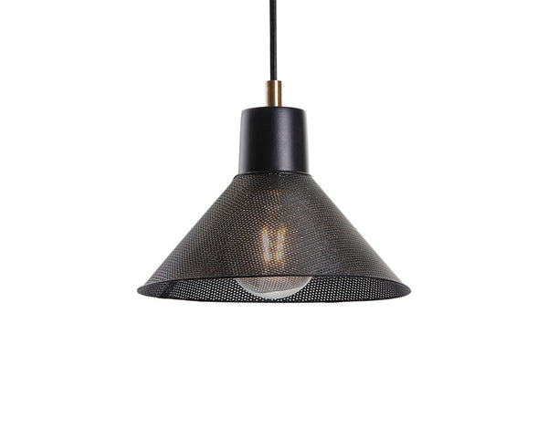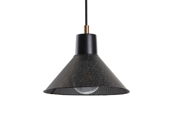 This sleek, industrial pendant light offers an edgy style to any space. Features a flared cone shade in black iron. Install in multiples for a dramatic effect.