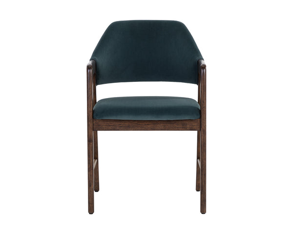 This mid-century modern dining chair combines luxury and warmth. Stocked in a variety of options including fabric, faux leather, and light wash or smoke acacia frames.