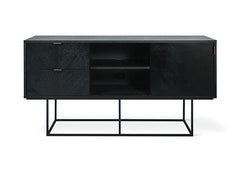 The Myles Media Stand combines subtle details and craftsmanship to create a storage design that exudes simple sophistication. Drawers feature rose gold handles contrasting dark stained, chevron-patterned oak faces. A recessed, slender steel base with black, powder-coated finish creates an illusion of weightlessness. Designed for Hi-Fi and media components, a back panel opening in the cabinet allows for concealed cable management.