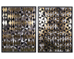 A multitude of diagonal shapes and patterns are accentuated with bold metallic highlights on this maximalist diptych. With its edgy style, these reverse printed acrylic pieces with gold leaf accents are finished with brushed solid wood frames in black.