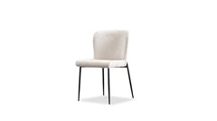 The Reef Dining Chair features a beautiful leg detail that hugs the seat of the chair in a black powder-coated steel. Reef is upholstered in two soft fabric choice: biscuit beige and chalkboard grey.