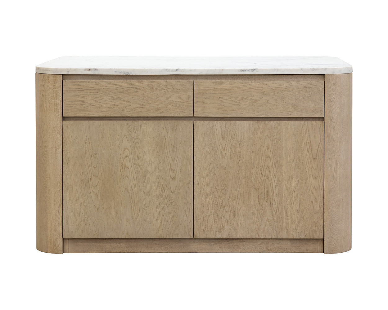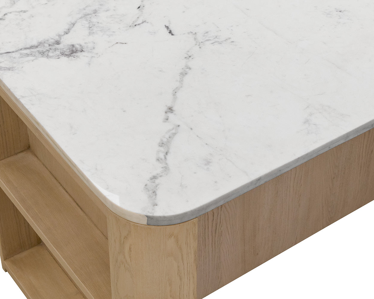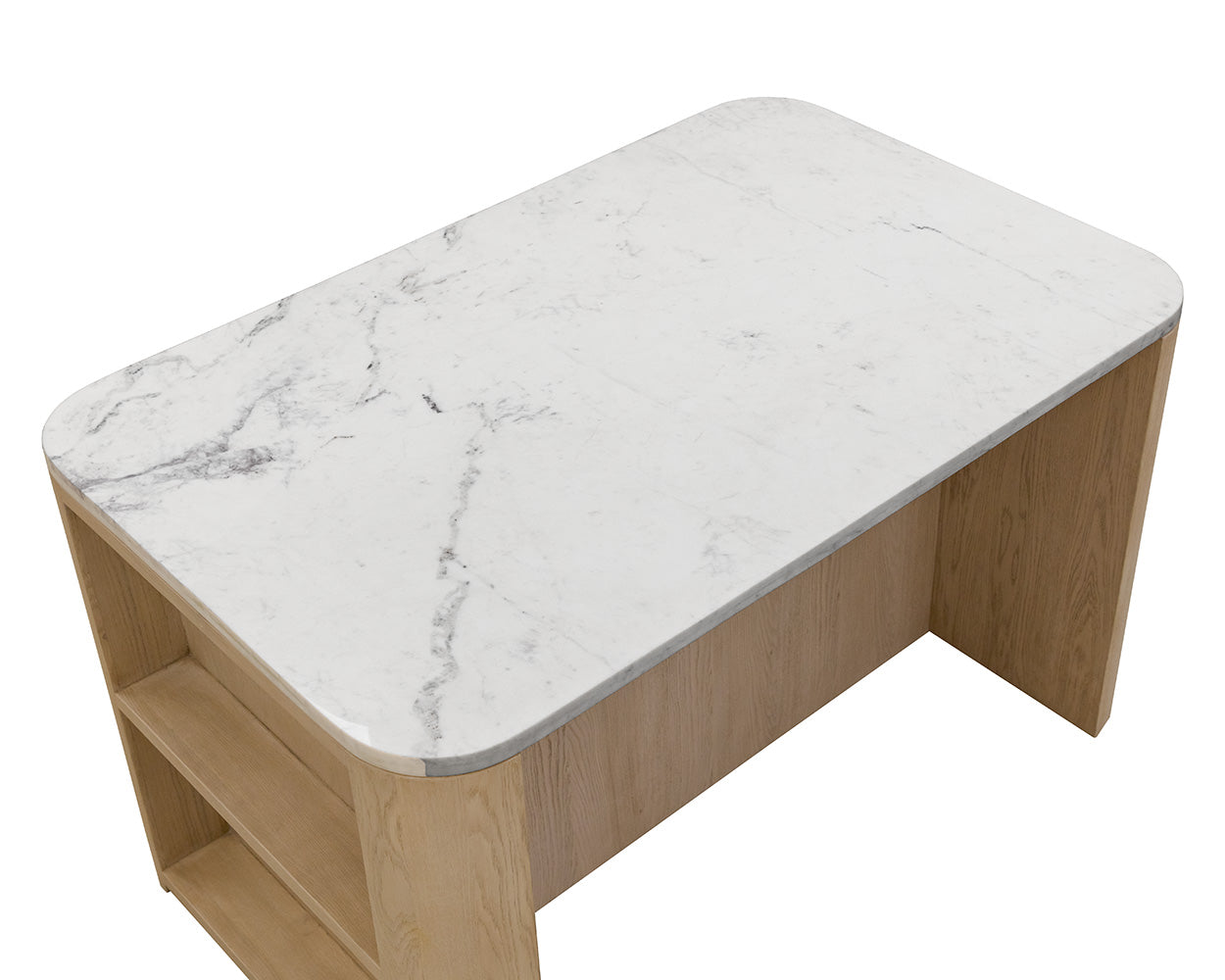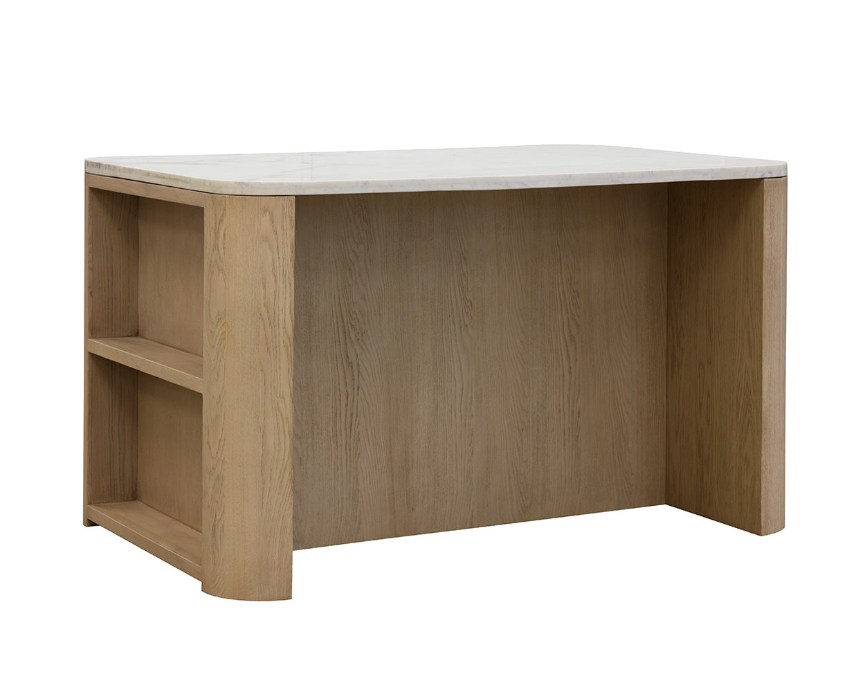 Designed to elevate everyday rituals, the Romilly Kitchen Island pairs a rounded rectangular silhouette with a Banswara marble top and warm oak wood base. Thoughtful open shelving and discreet soft-close drawers make it as practical as it is poised. Whether used in the kitchen or reimagined as a workspace, Romilly adapts effortlessly across any setting.
