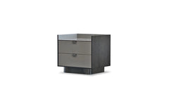 The Salazar Side Table boasts a refined design with polished smoke grey drawers set within a sleek eucalyptus veneer frame, creating a modern aesthetic. Its durable, neutral grey sintered stone top not only enhances the table's elegance, but also ensure longevity and resistance to wear, while the two drawers provide practical storage solutions.