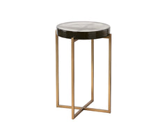 The handcrafted qualities of the Sheena End Table make it incredibly distinct. The rounded table top is made from hand-poured glass, showcasing an array of captivating imperfections that arise during the cooling process. An antique brass base finishes the look.
