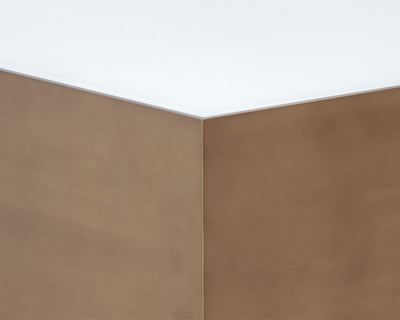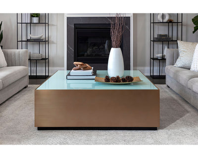 This large, stylish coffee table is elegant and modern. The unique white glass top is framed with a stunning brushed antique brass frame. Suitable for commercial and residential environments.
