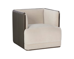 A bold form defines this modern and structured armchair that is guaranteed to turn heads. Features an interior upholstered in meg taupe fabric and an exterior in textured porcini taupe faux leather. Completed with an antique bronze stainless steel frame. Coordinating sofa also available. .