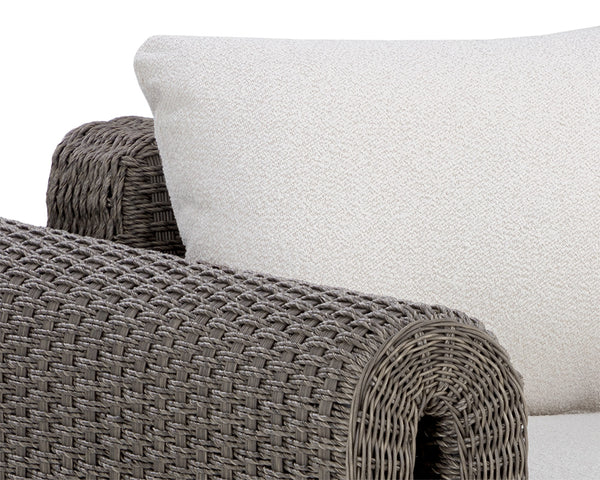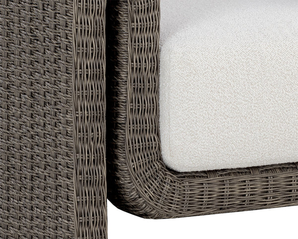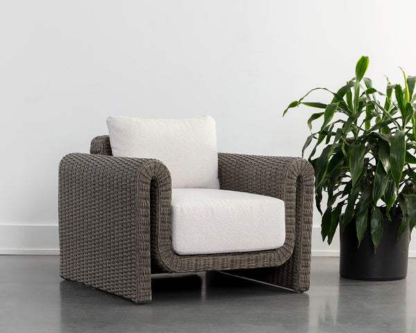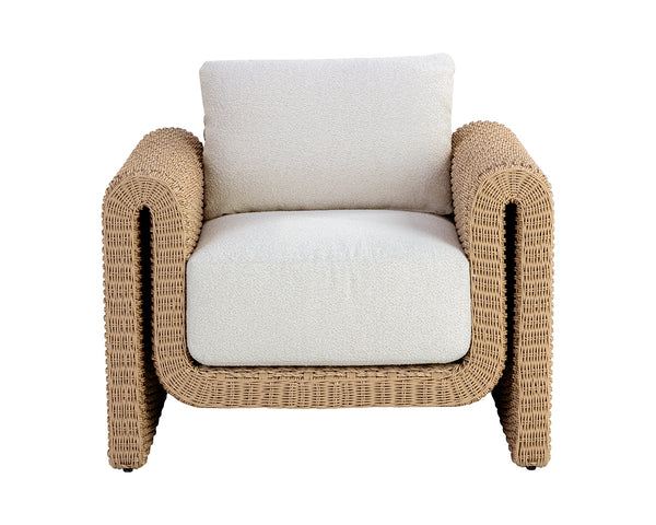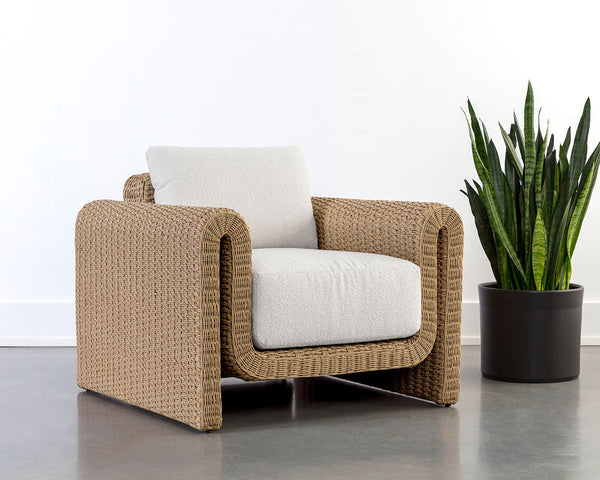 The robust proportions of the Tibi Lounge Chair enhance the textural beauty of handwoven twisted wicker. The rolled arms join seamlessly to nestle the comfortable cushioning upholstered in our louis cream outdoor boucle performance fabric.