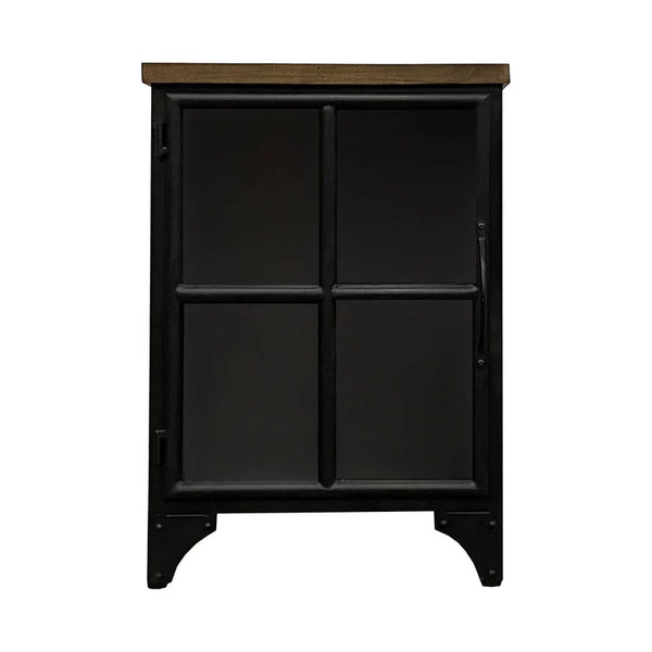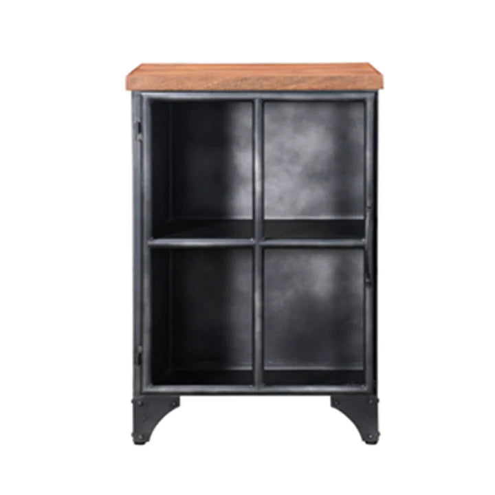 Reclaimed iron and naturally sourced mango wood compose this rustic piece. It features an iron base finished in a deep black that evokes summer nights, while its top is finished in a rich brown color that highlights the natural patterning and textures of the wood. Sturdy and stylish, this nightstand combines rustic practicality and elegant design. This metal cabinet is useable as a nightstand, side table, or even a small media unit. It has a traditional style front, warm wood finish top and a soft industrial metal casing.