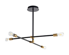 Complete an intriguing space with this modern sputnik-style chandelier. Features two adjustable crossing arms that can be rearranged. Stocked in brass and black finishes. Install multiples for a dramatic look. Requires 4 light bulbs and maximum 40 watts each.