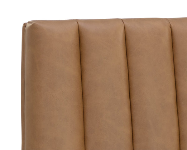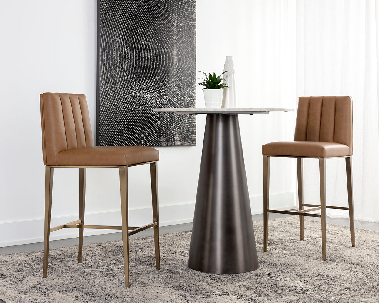 Minimal and classic best describes the Wilbur Barstool. Upholstered in milliken cognac faux leather with vertical channeling on the back seat for added flair. Finished with powder-coated stainless steel legs and a matching handle.