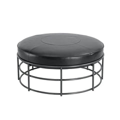 Round and versatile, this low-profile ottoman mixes smooth faux leather with subtle stitching for a clean, casual finish.